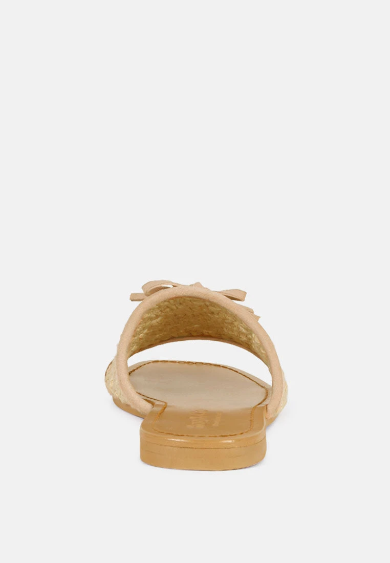 The Classic summer flats with 100% Natural cotton woven structure with soft suede frame detail and the tassels at the top. The square toe open slides are casual, comfort shoes from Rag & Co.