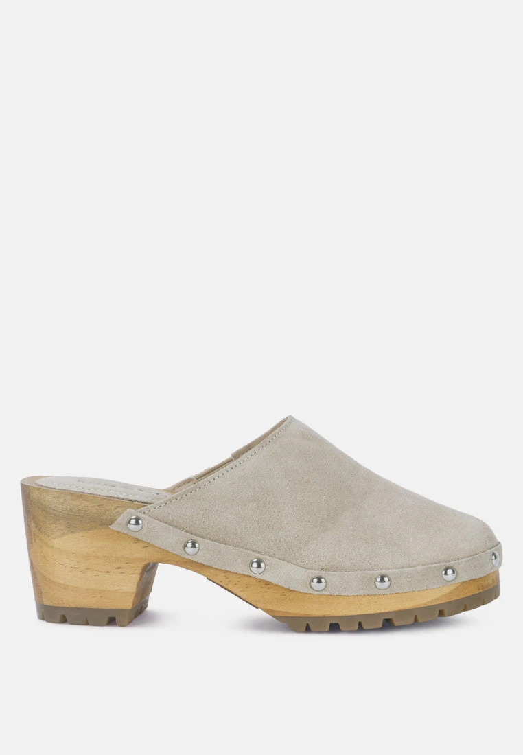 Round Toe Suede Clogs with Stud Details in handcrafted wooden heels has been handcrafted with precision and painstaking detail to fit each foot perfectly. The wooden block heel has stud details along the line and an anti-slip durable outsole which keeps you protected on all surfaces. Superbly stylish, available in limited quantities with ethically sourced fine leather suede.