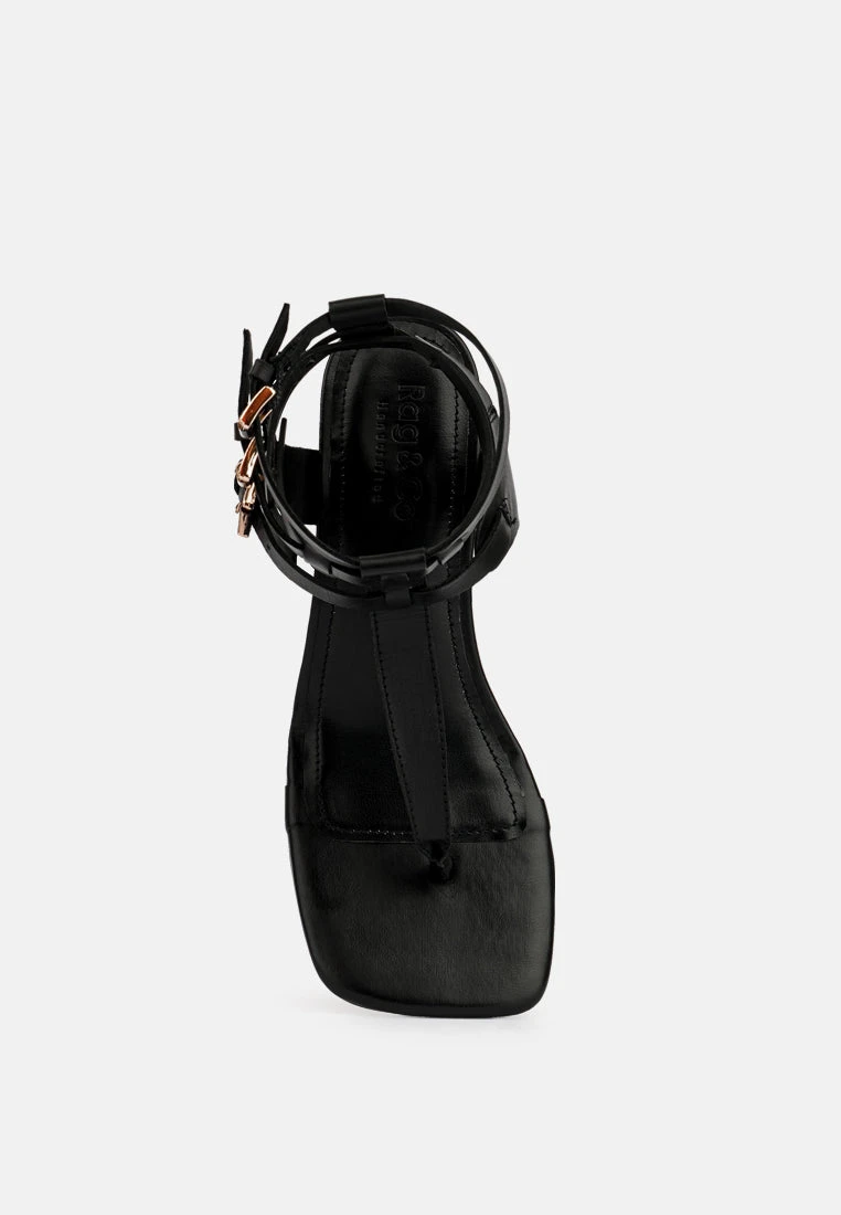 Buckled thong sandals, which wrap the ankle in style – have metallic pin buckle details which add to the look and accessibility. The cut out style sandal has open toe and heel and looks stylish on feet with little kitten heels.